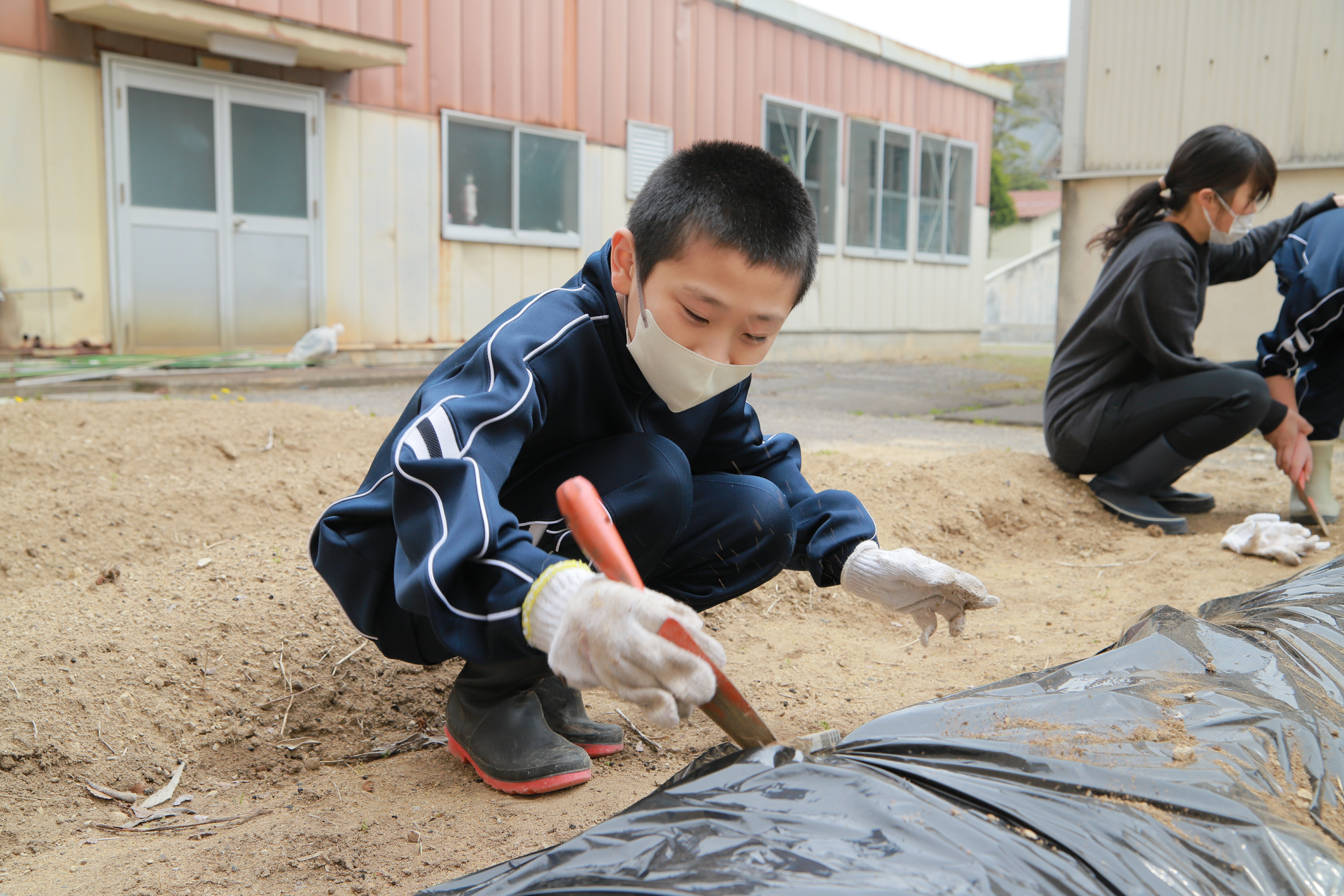 今年度の小学部ではレタスとサツマイモを育てることになりました。マルチを敷いて,スコップで穴をあけ,やさしく苗を植えることができました。雑草をとったり,水をあげたりして小学部の畑が完成しました!