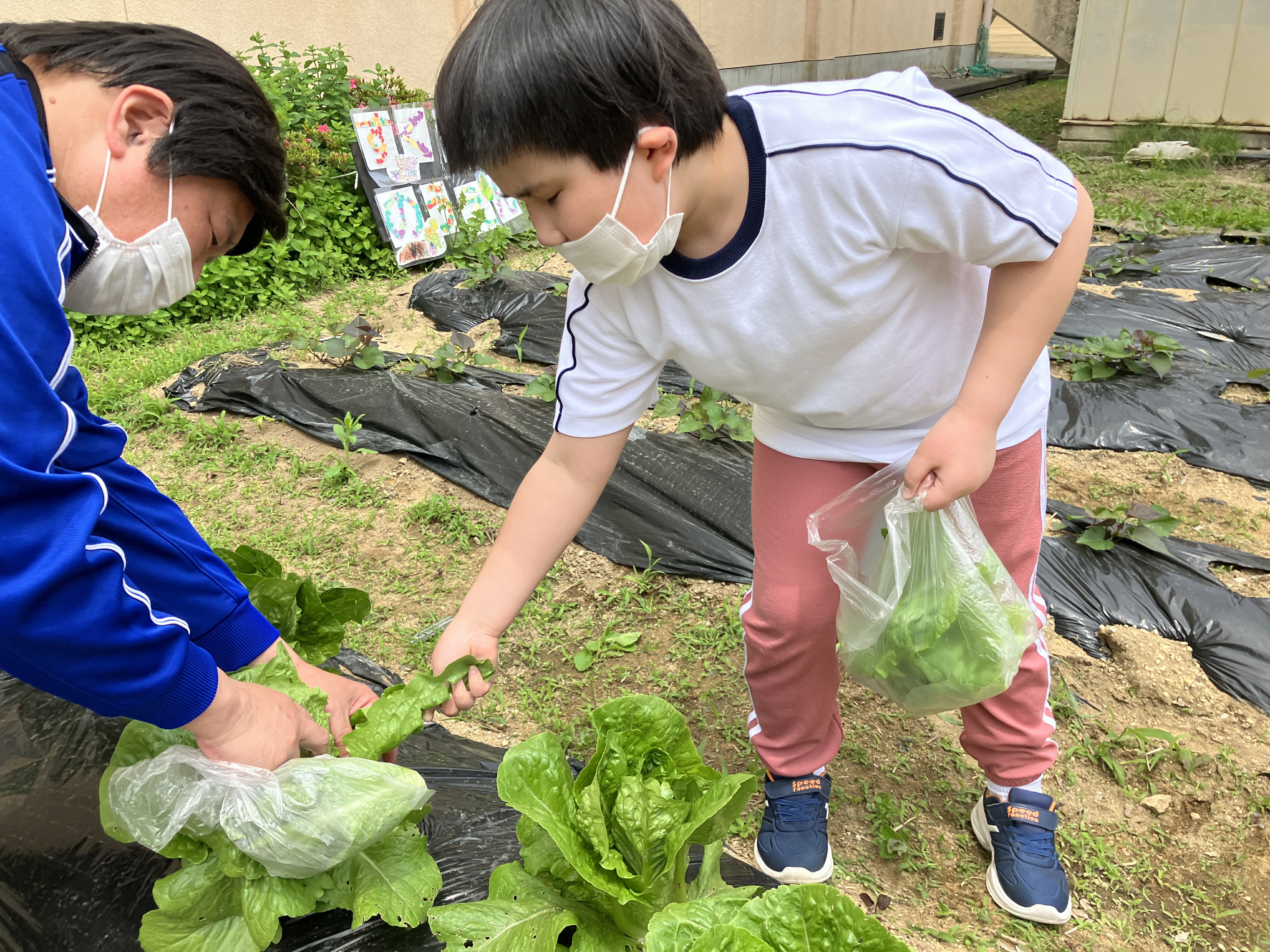 小学部のレタスが収穫を迎えました。大きくなったレタスのできるだけ根元の方をちぎって収穫しました!「お家でおいしく食べました」「お父さんお母さんも食べてくれました」と嬉しそうに教えてくれる子もいました。