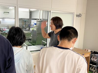 自分たちが食べている給食がどのように作られているかを学習しており、宝立小中学校の共同調理場へ見学に行ってきました。栄養教諭のお話を聞いたり、質問をしたりしながら調理の様子を興味深く見ている姿が見られました。