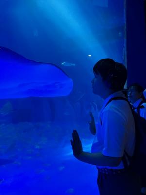 ライトで照らされてキラキラ輝く水槽に目を輝かせたり、優雅に佇むジンベイザメや、トンネルの中をスイスイ泳ぐ魚たちを観察したり、飼育員さんと息ぴったりなイルカショーを楽しんだりしました。