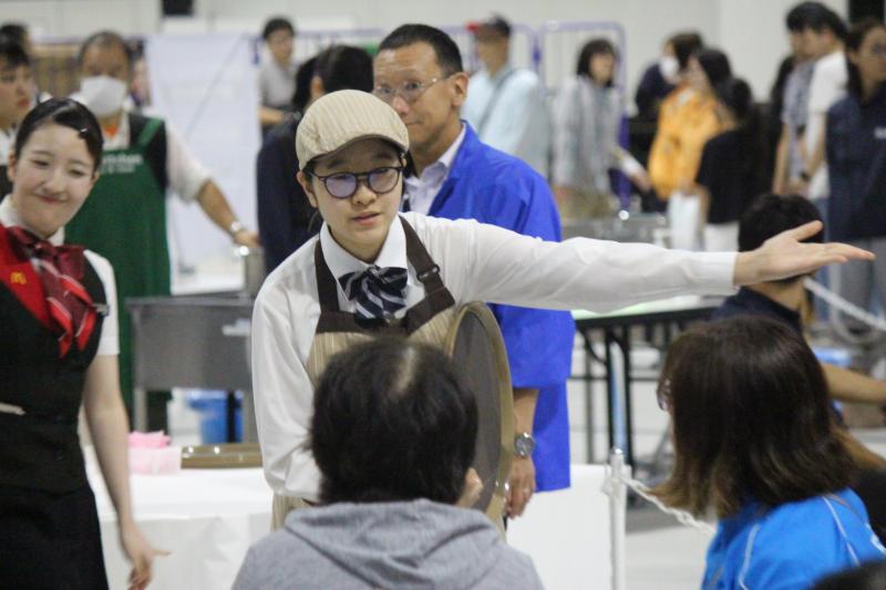 大会の競技内容はクジ引きで決まったグループのメンバー4人と協力して25分×2回、実際のお客様にサービスを提供するもので、お互いに声を掛け合い、どうすればいいかそれぞれが考えて<みんなで協力し合ってより良いサービスを提供する>競技です。自分なりにどうすればいいか考え、グループの方々に分からないことは質問したり、アドバイスをもらったりして、一生懸命接客をしてきました。