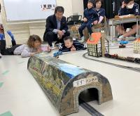 子どもたちは車掌さんになった気分で「しゅっぱーつ!」と言いながらスイッチを押し、ニコニコの笑顔で電車を見ていました。また、猫バスやトーマスの電車がトンネルから出てくるのを待って、出てくるとうれしそうな顔をしていました。