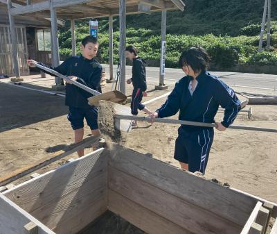 今週は、里海学習で珠洲市の名産品である「塩」についての学習を進めてきました。その中で、株式会社珠洲製塩さんで伝統のあげ浜式塩田法による塩作りの体験を行ってきました。職員の方の話を聞きながら、砂を集めたり、海水をまいたりして塩の作り方を学ぶことができました!生徒からは、「楽しかった」「勉強になった」などの感想が聞けました。