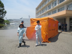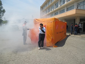 5月23日(火)午前11時30分、2階家庭室より火災発生したとの想定で避難訓練が行われました。非常ベルの後、校内放送の「おさない、はしらない、しゃべらない、もどらない」の案内に従って避難することができました。煙ハウスや水消化器を体験し、避難や防災の大切さを学びました。