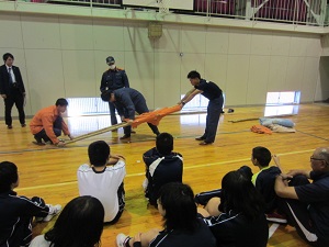 珠洲警察署の署員と生徒指導担当の中星教諭の寸劇を見ながら、誘拐事件に巻き込まれないようにするにはどうしたらよいか、みんなで学習しました。怪しげな人には近寄らない、連れて行かれそうになったら大声を出す、など、実際に練習してみました。