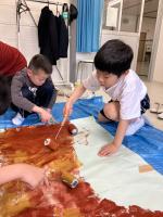 図工の時間に「石川県特別支援学校 ホッと・アーッと展」に出展する作品を製作しました。今年は、絵の具や画用紙、紙粘土などの材料を使って大きな木を作ります。紙をちぎって葉っぱを作ったり、絵の具をローラーで伸ばして木の幹を表現したりしました。みんなの頑張りのおかげで、勢いのある力強い木の幹が完成しました!これからどんな木になるのかな?