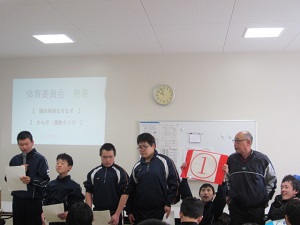 体の仕組みや運動の効果についてクイズ形式で発表しました。