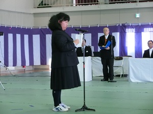 離任式では、転勤される4名の先生からメッセージを頂き、児童生徒から感謝の気持ちを込めて花束をプレゼントしました。