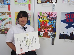 8月24日(土)に産業展示館において、環境月間ポスター展表彰式がありました。昨年の傳保宗栄さんに続き、今年は坂口史帆さんが優秀賞を受賞しました。谷本県知事から直接賞状を頂き、記念写真も撮りました。おめでとう!!