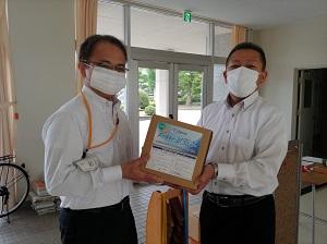 5月19日、学校の再開(6月1日から)に備えて役立ててほしいと、珠洲ロータリークラブの青少年奉仕委員長干場龍一さんから除菌効果のある次亜塩素酸水2箱(1箱10リットル入り)を寄贈していただきました。