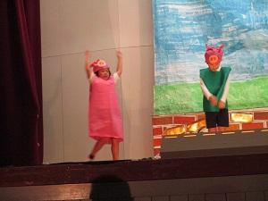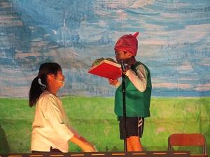 小学部では、「四匹のこぶた」という誰もが知っている「三匹のこぶた」のお話をモチーフにオリジナルのストーリーで劇をしました。オオカミに追いかけられる子豚たちの躍動感ある演技はとっても印象的でした。また、音楽発表では、「はらぺこあおむし」の話に合わせて色々な楽器で演奏し、最後には小学部全体で作ったはらぺこあおむしの絵を掲げました。