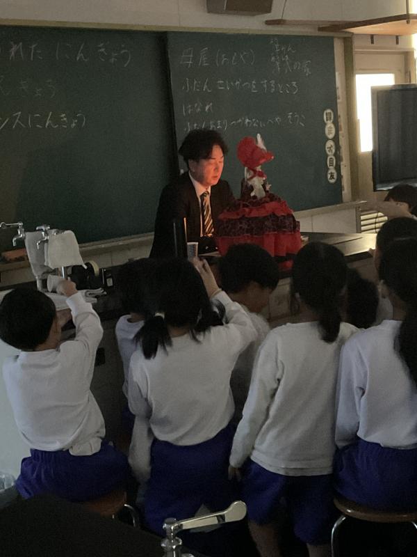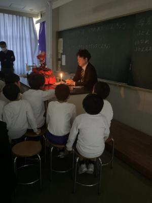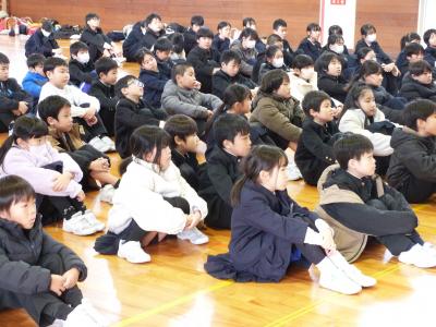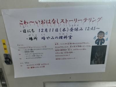 12月11日(木)昼休みには、本校勤務の図書館司書 古澤先生による恒例の「こわ~い話」がありました。予定では、全学年が一斉に聞く予定でしたが、かぜやインフルエンザで休んでいる人が特に高学年に多くいたため、感染予防のために、今回は低学年だけの開催としました。子ども達は、こわい話が大好き。多くの低学年の子ども達が集合。