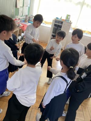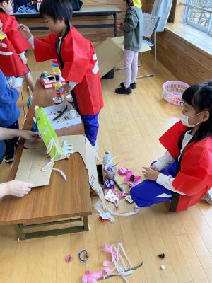 12月22日(月)、1年生が庄保育園の年長さんと交流を行いました。1年生が年長さん達を学校に招待し、生活科で作ったおもちゃで遊ぶお祭りを開きました。