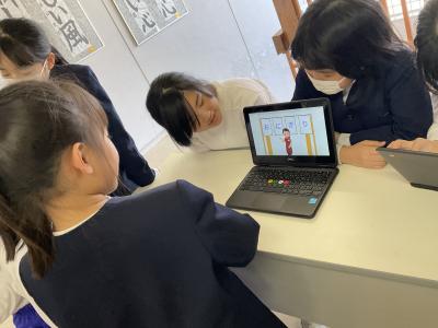 4年生の教室をのぞくと、タブレットを使って、何やら楽しそう。よく見ると、4年生が総合的な学習の時間を使って、これまで自分たちで調べた加賀市の魅力について、スクラッチという機能を使ってプレゼン動画を作成し、その発表を練習していました。