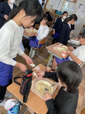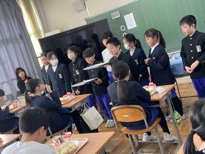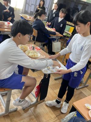 12月22日(月)の昼休み、5年生がお米レストランを開きました。5年生が田植えや稲刈りをし、寺井さんに育てていただいたお米で、5年生がおにぎりを作り、昼休みに全校のみんなにプレゼントしてくれました。