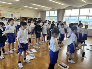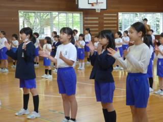 5月19日(月)の朝活動の時間に、明日連合運動会に参加する6年生に向けて、壮行会を行いました。サブリーダーである5年生が中心になって、全校でエールを送りました。