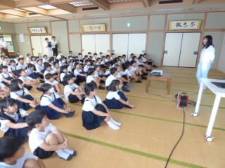 その後の学校保健委員会では、よい姿勢が体と心の成長に影響することを養護の福嶋先生と、てまりフィットネスの角谷先生から教えていただきました。角谷先生からは、姿勢がよくなるストレッチも教えていただき、1~6年生の児童と保護者の皆さんが一緒にストレッチを体験しました。中には「いたい~!」の声も聞こえましたが、おうちの方と楽しくストレッチができ、みんな嬉しそうでした。