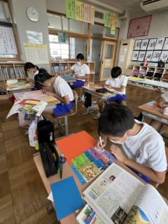 課題図書について、少しだけ内容の紹介があり、その後は「味見読書」をしました。「味見読書」とは、名前から分かるように味見するように少しだけ読んでみる読書だそうです。3年生も4人グループで少しだけ読む「味見読書」を味わった後で、自分が興味を持った本を選びました。