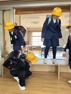 対面式の後は、1・2年生の交通安全教室です。道路を渡る時は、しっかり止まって右・左・右を確認し、手をあげて横断することを学習しました。