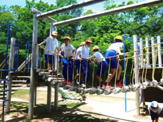 行き先の中央公園では、たてわりグループに分かれ、高学年が考えた遊びをしました。鬼ヶ島やおとぎの国のお城で「鬼ごっこ」や「かくれんぼ」、ちびっ子広場で「しっぽ取り」、音楽堂で「だるまさんがころんだ」など、どの子も思い切り体を動かし笑顔いっぱいで遊び楽しむ姿が見られました。