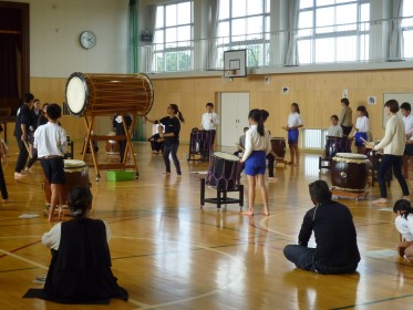 6年生の親子活動として、笠間地区に伝承されている弓堀太鼓の保存会の皆様に毎年来ていただいています。実際に太鼓をたたいて演奏するところがとても楽しそうでした。