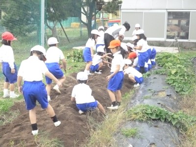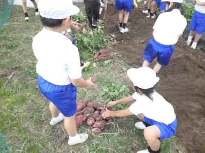 1組は、運動場の畑のいもほりをしました。おおきなおいもに大喜びしていました。