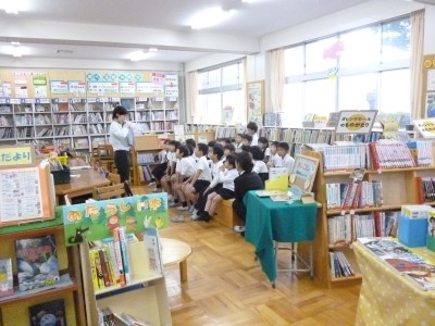 図書館では、2組が司書の読み聞かせを聞きました。本の世界に浸っていました。