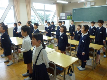 2、3年生が、朝の会で元気に今月の歌を歌っていました。