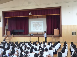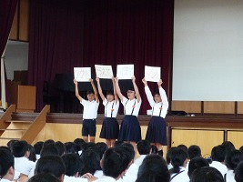 本日10月の全校集会と児童集会を行いました。全校集会ではホワイトボードを使って考えをたくさん交流できる授業にしようというお話でした。児童集会では生活委員が「かかとをそろえておくまでとん」で靴がきれいにそろうことや図書委員から図書館貸出合戦の結果発表がありました。
