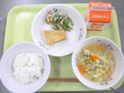 高野豆腐の唐揚げ、切り干し大根の梅あえ、あおさのかき玉汁・ご飯・牛乳です。
