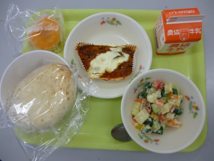 本日のメニューは、パン、ムサカ、グリークサラダ、デザートです。