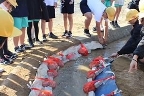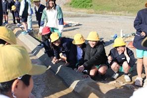 まず、金沢河川国道事務所の方から、手取川の特徴や堤防についてのお話をお聞きしました。その後、疑似河川が氾濫し、堤防が決壊する様子を観察しました。観察したことから、水防対策をグループみんなで話し合い、実際に堤防を補強しました。堤防が水の流れに耐え抜くと、みんな「やったー!」と声をあげていました。