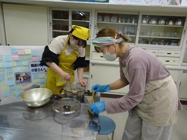 どのように下ごしらえをしたり、調理を進めたりしているかについて、手作りの教材で教えてくださいました。調理員さんと一緒に食べることで「いつもよりおいしい!」という声も聞こえました。