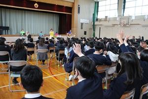 次の日には全校集会で、校長先生から「人権」についての話がありました。「どうすれば人権が守られるだろう」という質問に、1年生から6年生までしっかり考え、たくさんの人が発表していました。