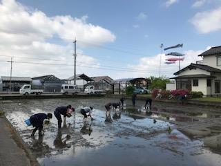 5年生の米作り。楽しみにしていたであろう田植えを、5年生に代わり、JAの皆さんと先生方(給食の先生にもお手伝いいただきました。)でしました。機械ではなく、2時間ほどかけて手で植えました。