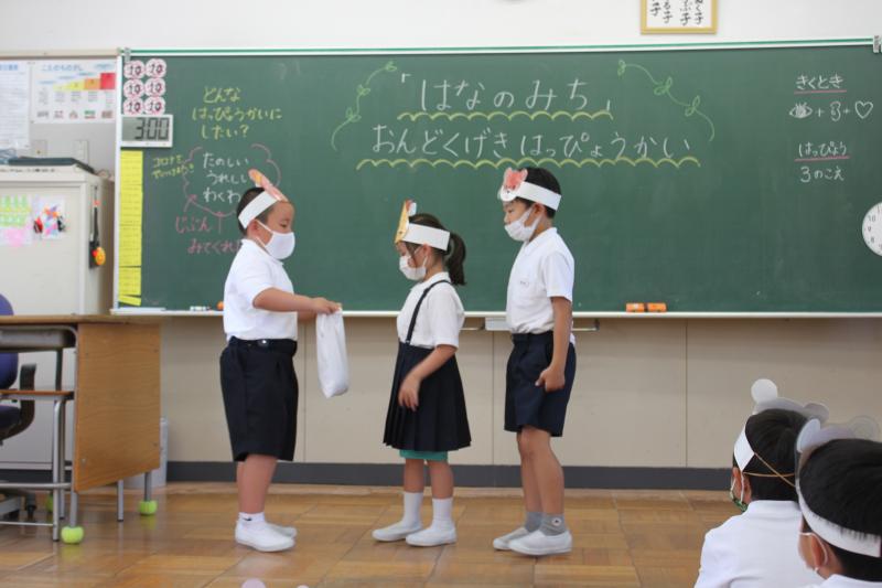 1年生が休み中から音読をしてきた「はなのみち」のおんどくげきをして、見せてくれました。