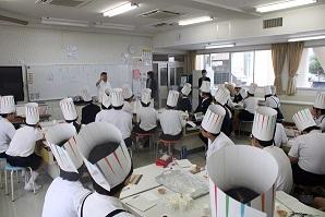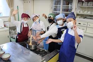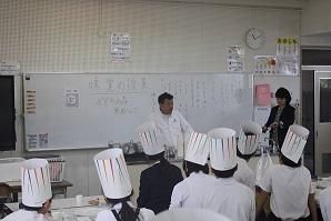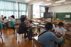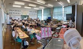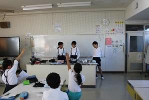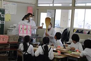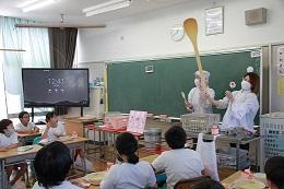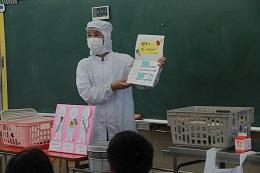 今月は、4年生の教室に給食調理員の先生方がやってきてくれました。