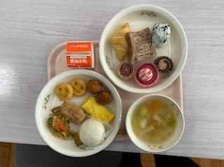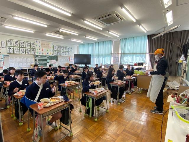 コロナ前の一昨年度までは、お世話になった先生もお招きし、バイキング形式で行っていたのですが、昨年度からは、一人ずつ、お盆にのせた状態で、豪華なメニューで、おいしいごちそうをたくさんいただきました。お祝いを祝う音楽を流しながら、黙食という形でしたが、みんな幸せそうな顔でいただいていました。全部食べられるか、心配しましたが、おかわりも含め、完食でした。