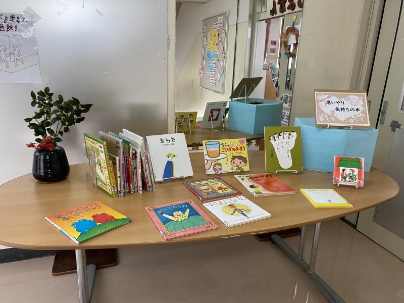 図書室前には、相手との関わりを考える掲示物や本の紹介も・・