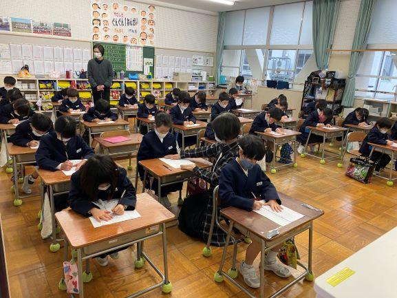 1・2年生は硬筆で、それぞれ「お正月」「はつ日の出」を題材にした文を書きました。