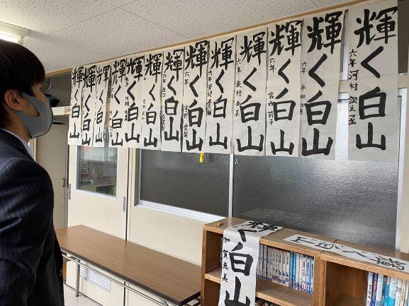 3年生以上は、2学期に町の先生山本先生からご指導を受け、練習してきた成果を発揮し、皆集中し、思い思いに筆を走らせていました。どの学年も川北にちなんだ題材の言葉で、川北への郷土愛も込めて書きました。