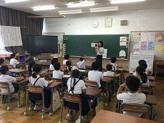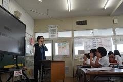 7月12日(金)、4年生の教室で、化粧品会社にお勤めの平田さんにお話をしていただきました。視覚障害者が自信をもってメークできるよう、何度も研究を重ねメーク方法の開発をしてきたお話から、「みんながハッピーになる社会をめざすには・・・・」を考えるきっかけになりました。