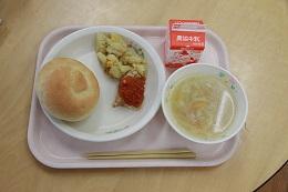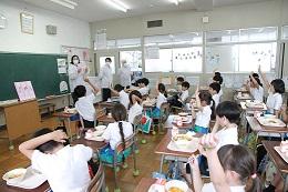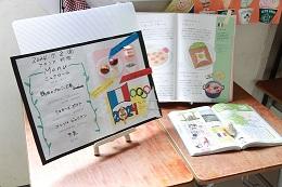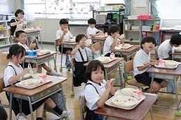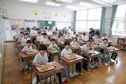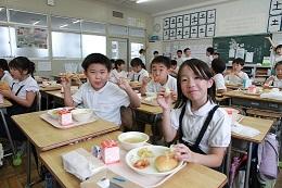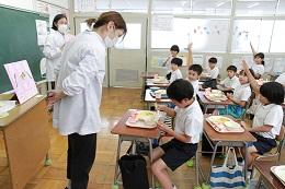 「ごちそうさま」の後には、いつもおいしい給食を作ってくださる調理員の先生方へ、全員で感謝の気持ちを伝えました。