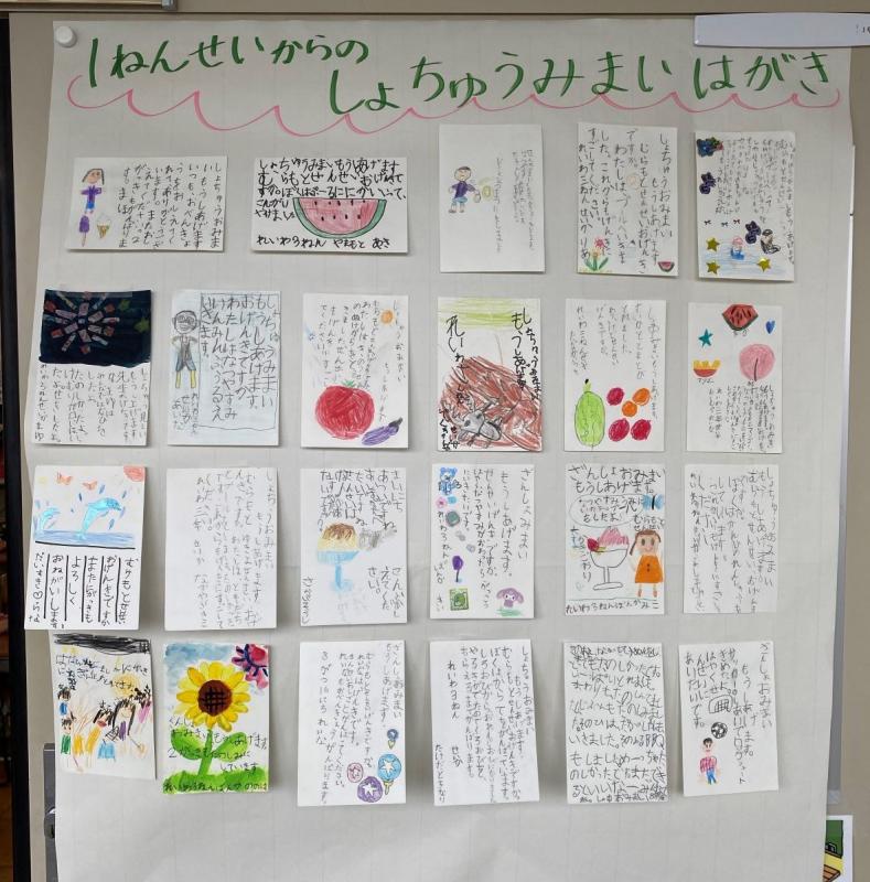 1年生の夏休みの課題で出された暑中お見舞い、素敵な夏を過ごしたことやお家に人と楽しんで書いたのが伝わってきいます。