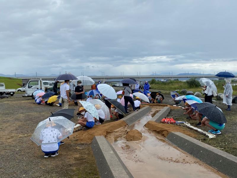 川の流れによる浸食を確認した後、自分達で堤防を守るべく知恵を出し合って、3つのアイテムを使い、堤防を固めました。左側が,中島小学校5年生、右側が本校5年生です。