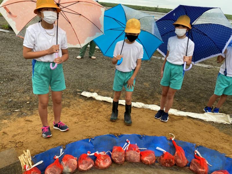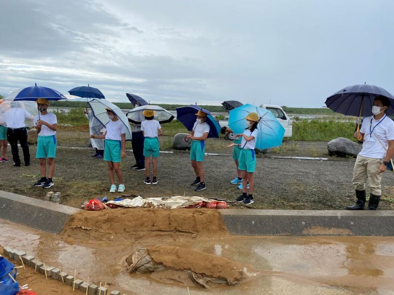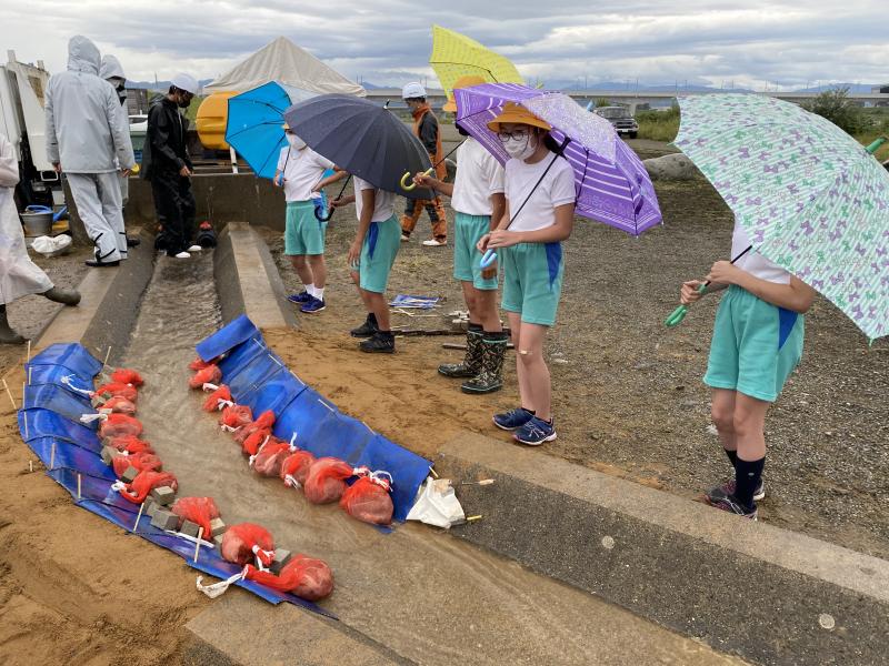国土交通得省に事業で、今年度より、5年生が水防学習をすることになりました。延期になっていた水防学習ですが、天候の関係で、急遽,中島小学校と一緒にすることになりました。