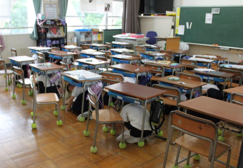 当初は、通常使用している東階段が地震により使用できず、非常階段を使って逃げ、運動場に集まることを想定していましたが、雨により非常階段が濡れて危険なため、通常通りの階段を使い、体育館に避難する練習をしました。今年度初めての訓練、1年生にとっては小学校初めての避難訓練でしたが、みんな「おはしも=押さない・駆けない・静かに・もどらない」の約束を守り、「自分の命を守る行動」ができました。