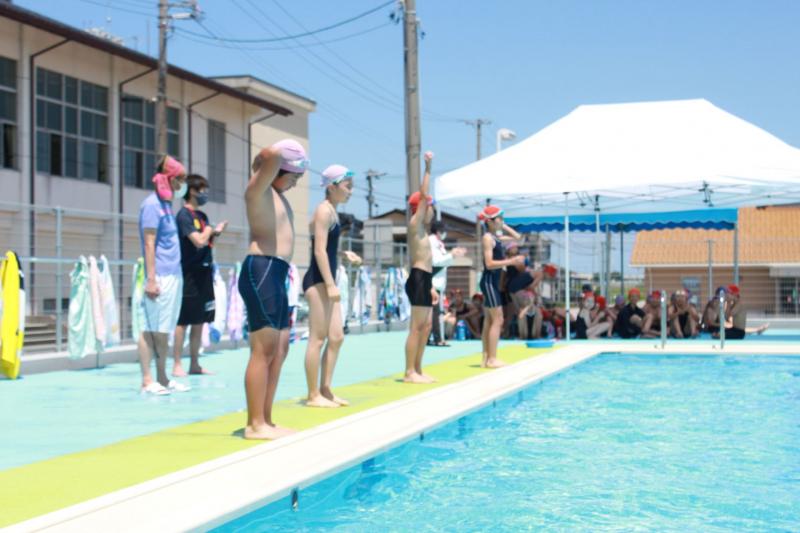 晴天に恵まれ、予定通り、7月19日(月)に水泳記録会が行われました。水泳記録会は、今年度も校内で行われました。テントを一つ増やし、今年は、56年生合同で行いました。