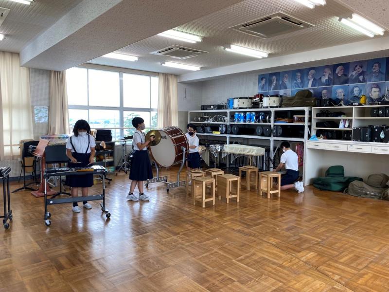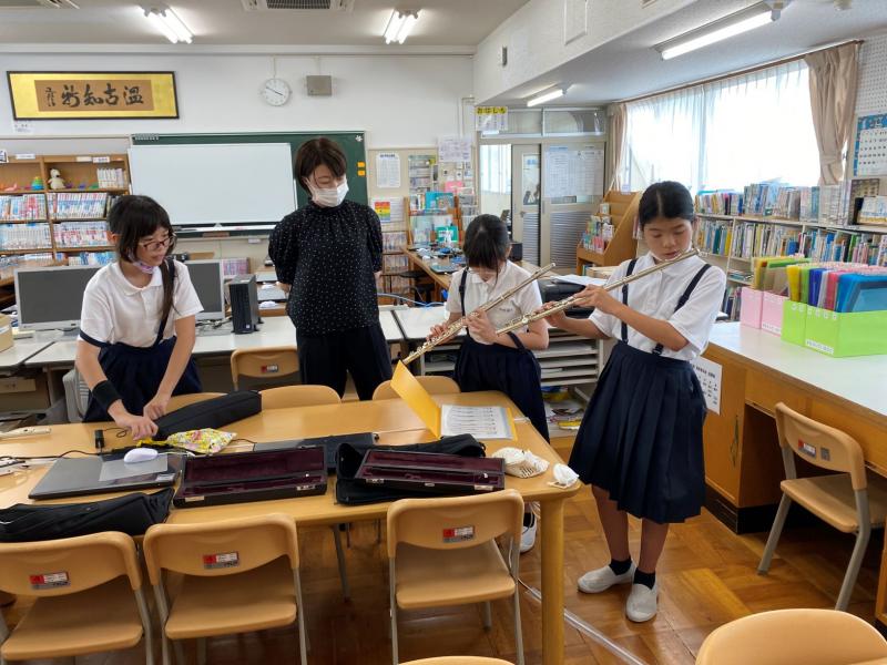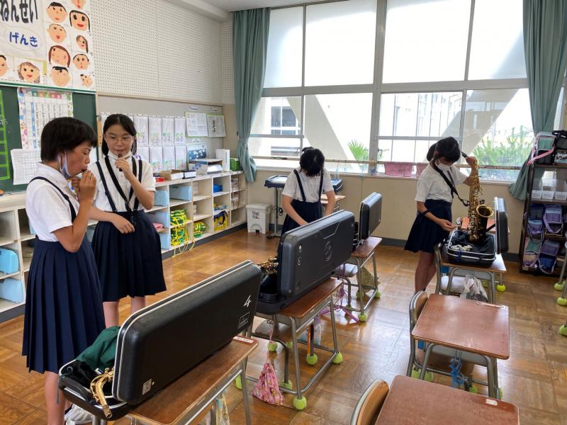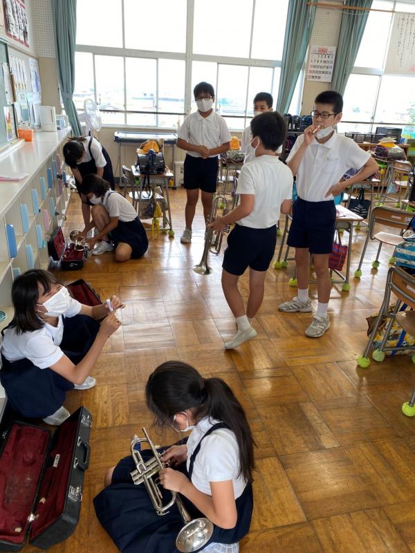ブラスバンド練習が再開され、楽器を演奏することを楽しみにしていた4年生は、6年生に習いながら、マウスピースやリードの練習、それにそれぞれの楽器の音階練習もしています。楽器を家に持ち帰ったり、昼休みの練習したりして、とても意欲的にがんばっている5年生。5・6年生で演奏する校歌がとても楽しみです。