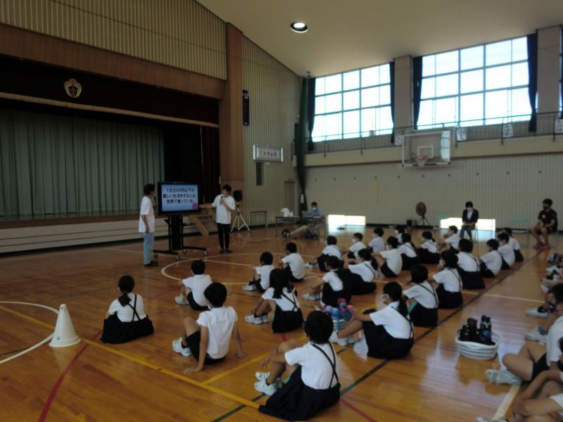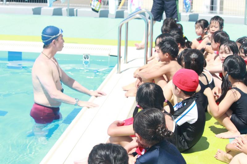1・2年生は水と仲良しになること、3・4年生は水に体をあずけ推進すること、5・6年生は目標を持ち泳ぐことなど、それぞれの学年に応じた指導を行っていただいています。